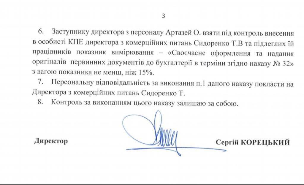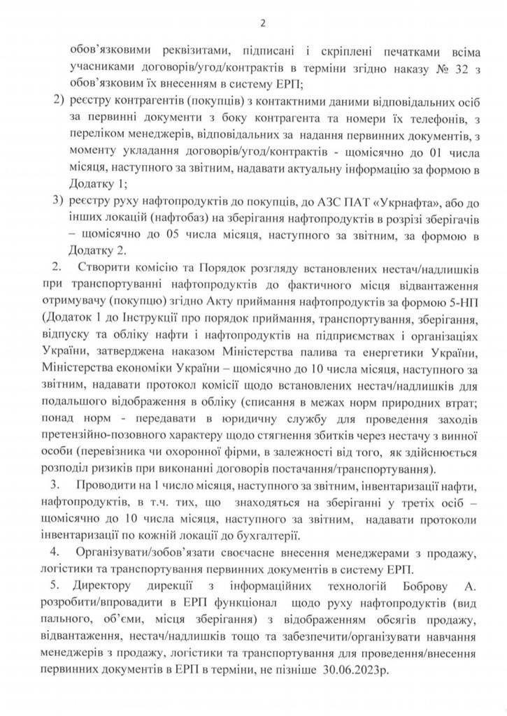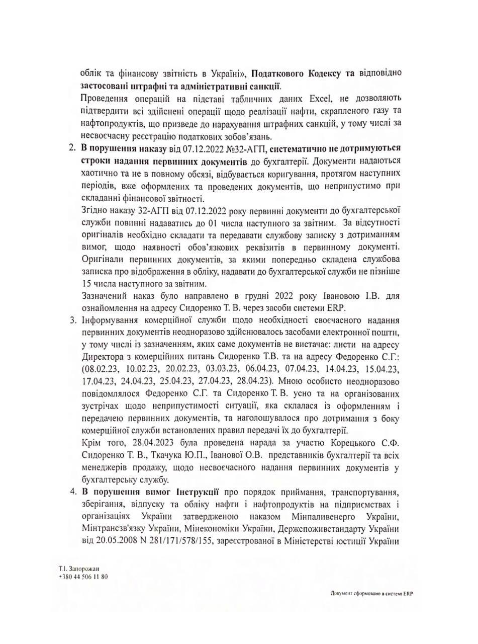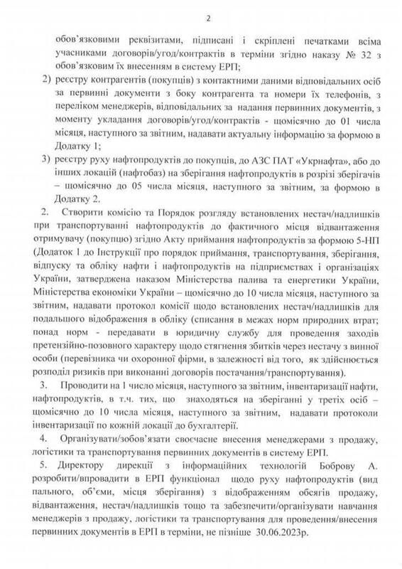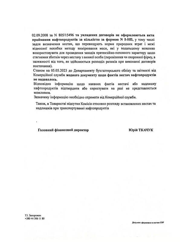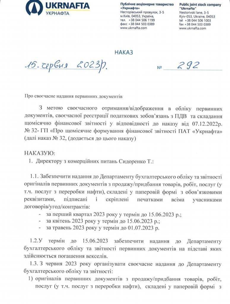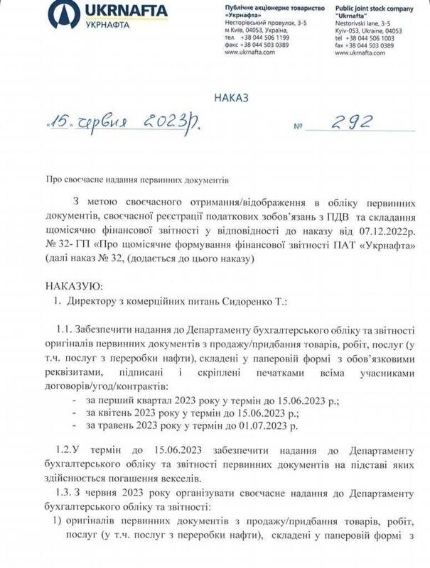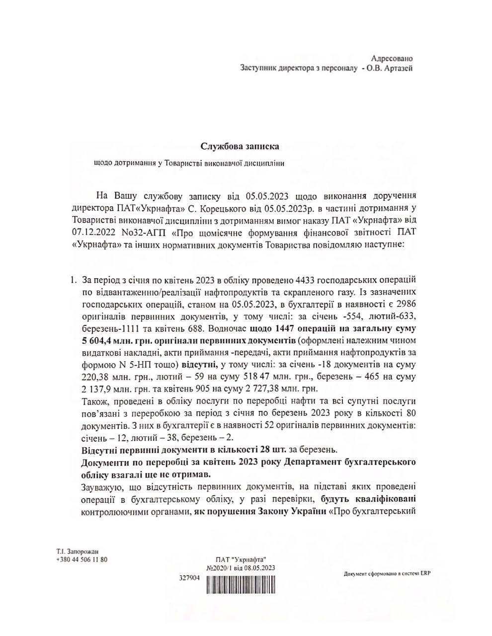 According to a memo from the Chief Financial Officer Yuriy Tkachuk, it is apparent that the accounting department lacked almost half of the primary documents related to the sale of products (petroleum products and liquefied gas) in the first quarter of 2023, amounting to 5.6 billion UAH as of June. A similar situation occurred in the second quarter, as confirmed by Koretskyi’s order No. 292 dated 15.06.2023. Such discrepancies indicate the absence of reliable accounting records.