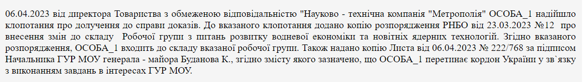 “The aforementioned petition includes a copy of the NSDC order dated 23.03.2023 No. 12 on amendments to the composition of the Working Group on the Development of Hydrogen Economy and Advanced Nuclear Technologies. According to the specified order, PERSON_1 is a member of the said working group. Additionally, a copy of a letter dated 06.04.2023 No. 222/768, signed by the Head of the DIU of the Ministry of Defence, Major General Budanov K., was provided, stating that PERSON_1 crosses the Ukrainian border in connection with performing tasks in the interests of the DIU of the Ministry of Defence,” as noted in the court materials.
