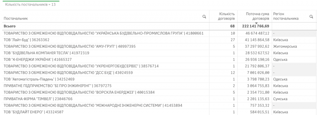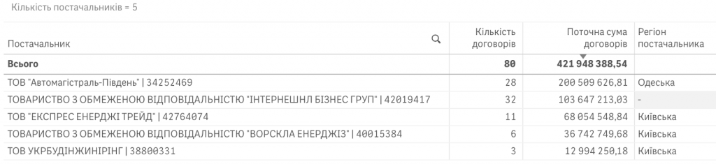 Загальна ціна договорів складала 449,7 млн гривень. Три договори на 10,49 млн гривень розірвали, решта 80 договорів значаться як виконані, оплата за фактично виконані роботи по ним склала 421,94 млн гривень.