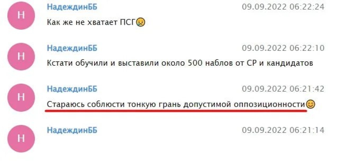 Згідно зі скриншотами листування, на виборах мера Москви у 2022 році Борис Надєждін схарактеризував свою політичну діяльність такими словами: "Стараюсь соблюсти тонкую грань допустимой оппозиционности".