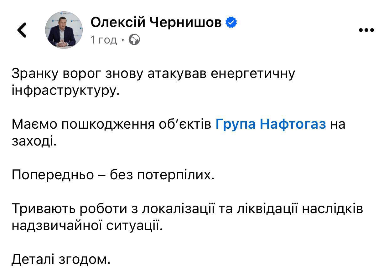 “In the morning, the enemy again attacked the energy infrastructure,” - Naftogaz of Ukraine