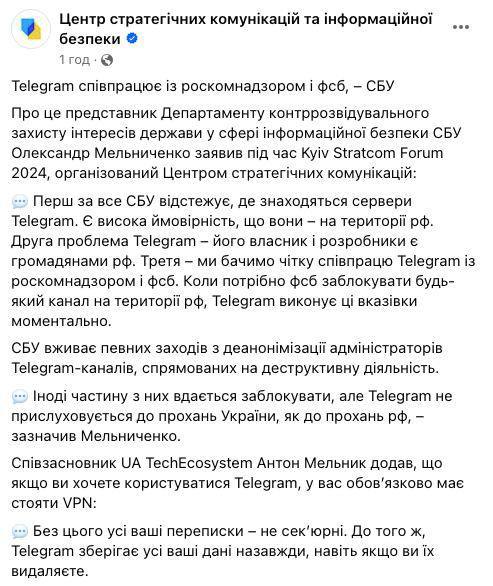 “We see clear cooperation between Telegram and Roskomnadzor and the FSB. When the FSB needs to block any channel on the territory of the Russian Federation, Telegram carries out these instructions instantly,” Melnychenko said during the Kyiv Stratcom Forum 2024, organized by the Center for Strategic Communications.