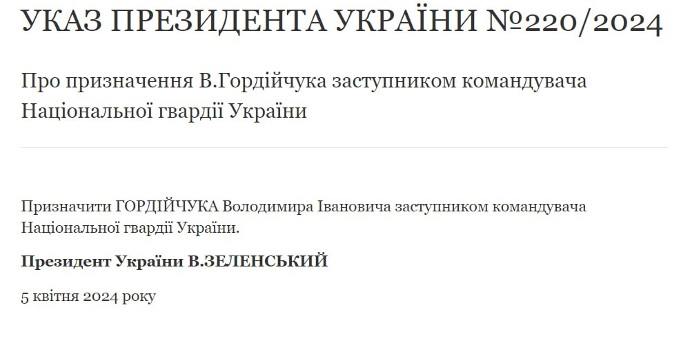 Lieutenant General of the National Guard of Ukraine Volodymyr Hordiychuk was appointed to the position.