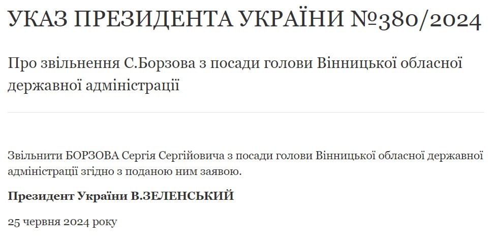 Zelenskyy signed a decree dismissing the head of Vinnytsia Regional Military Administration Borzov
