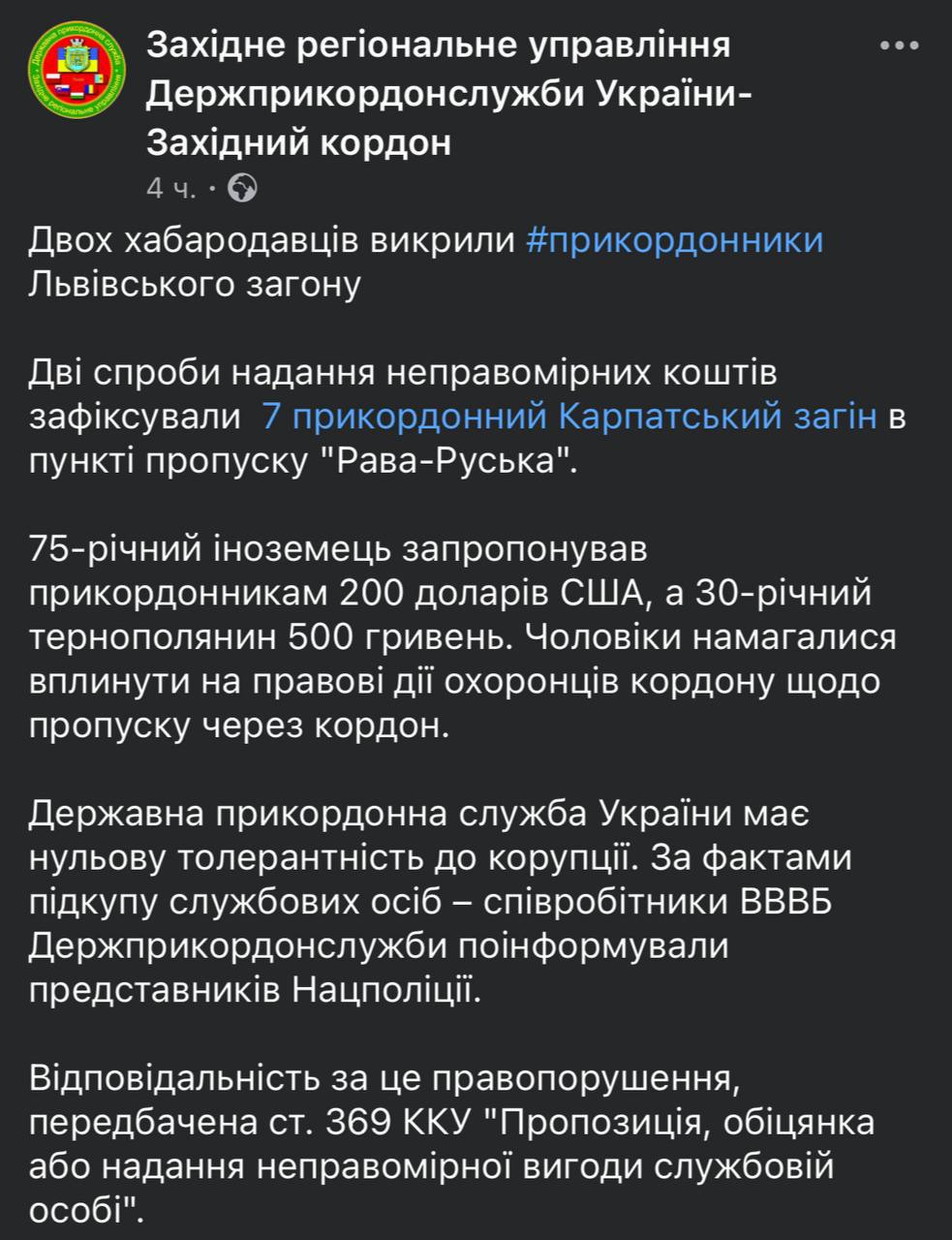 According to the State Tax Service, a 75-year-old foreigner offered the border guards $200, and a 30-year-old resident of Ternopil offered the border guards 500 UAH, but they did not accept a single bribe.