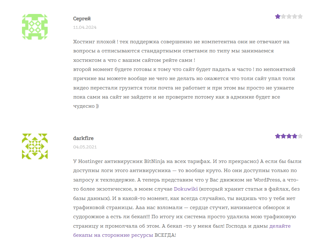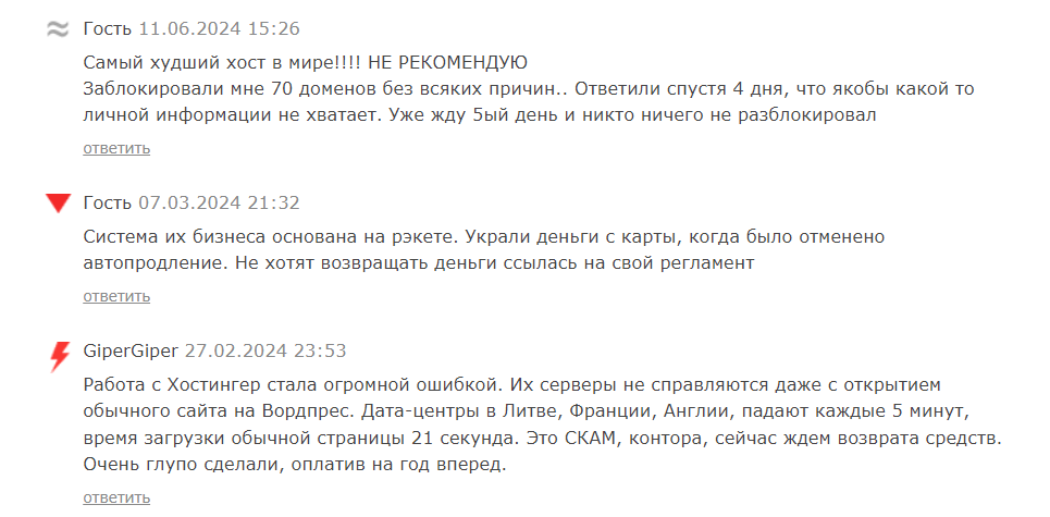 Hostinger customers complain more about poor technical support, which sometimes does not respond for several days. And this despite the fact that if the site stops working, then you need to get help from the provider in a matter of minutes.