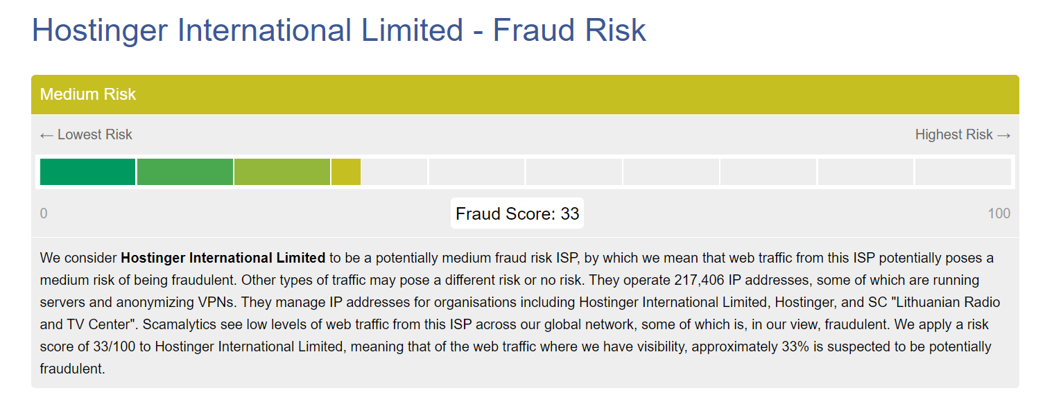 On the fraud rating scale, Hostinger has a rating of 33%, which clearly does not describe the company as reliable. “We consider Hostinger International Limited to have a potential medium risk of fraud, meaning that web traffic from this provider has a potential medium risk of being fraudulent,” Scamalytics experts say. Note that the analysts analyzed the Cypriot company Hostinger International Limited, and not the Lithuanian Hostinger.