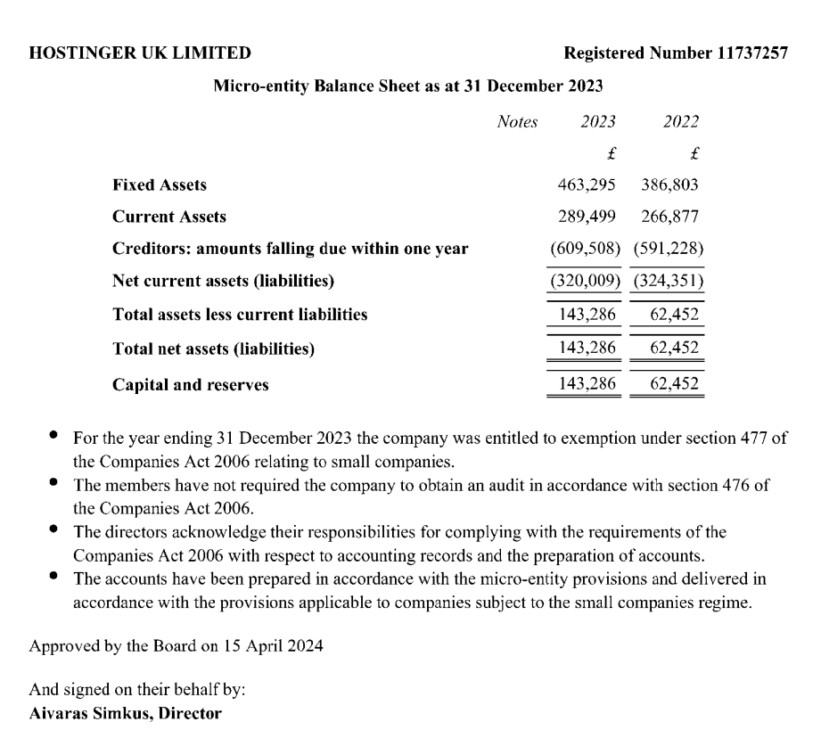 The firm’s fixed balance sheet in 2023 was £463,295. However, the amount of loans that Hostinger UK limited had to repay last year reaches £609,508.