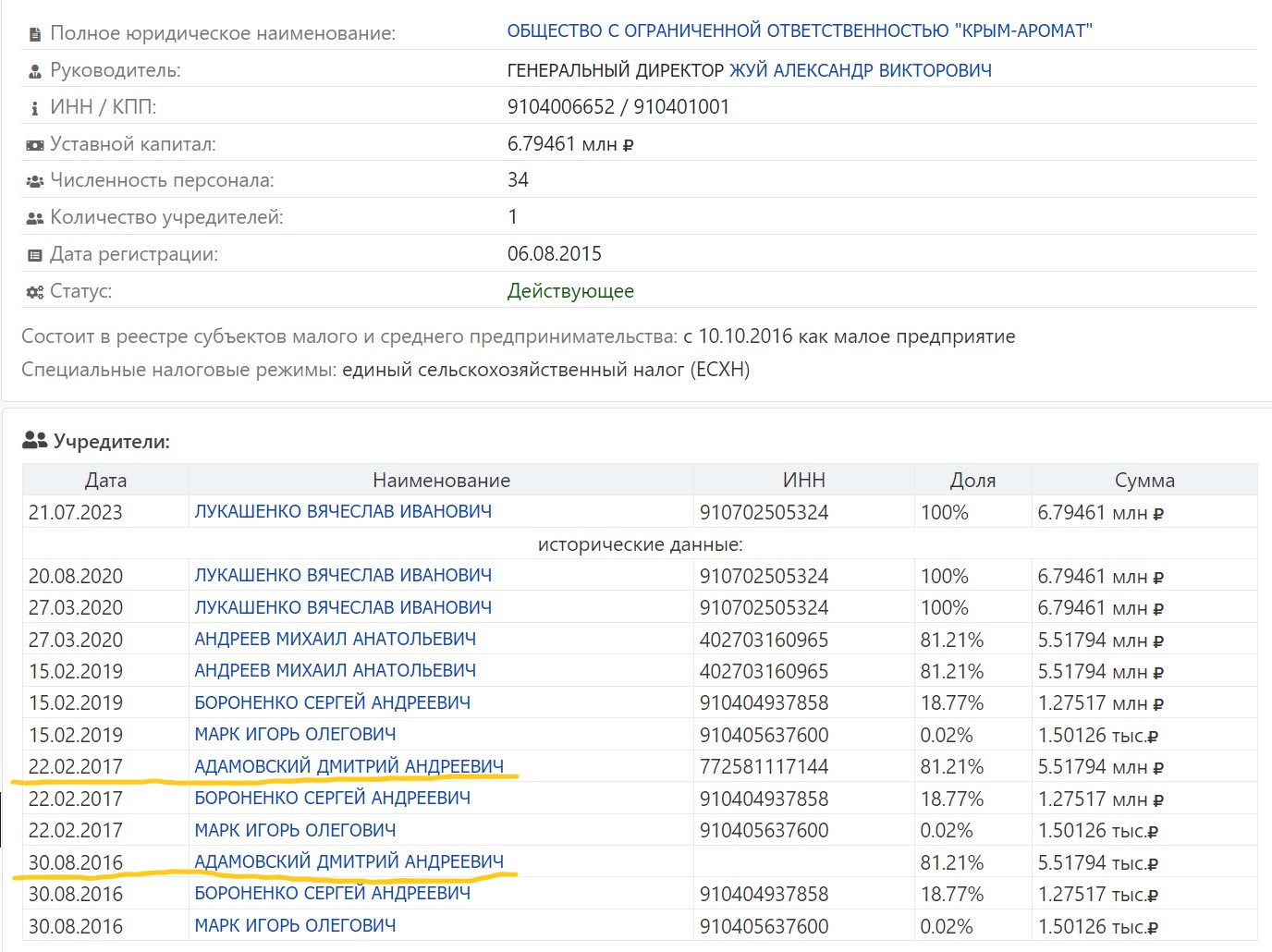 But what is more interesting is that the exit from the business in Russia was purely formal - Dmytro Adamovskyi simply re-signed it over to fictitious persons. Firstly, there is Vyacheslav Lukashenko, who was transferred to Krym-Aromat LLC. The company, by the way, is successfully operating and earned 24 million rubles last year: