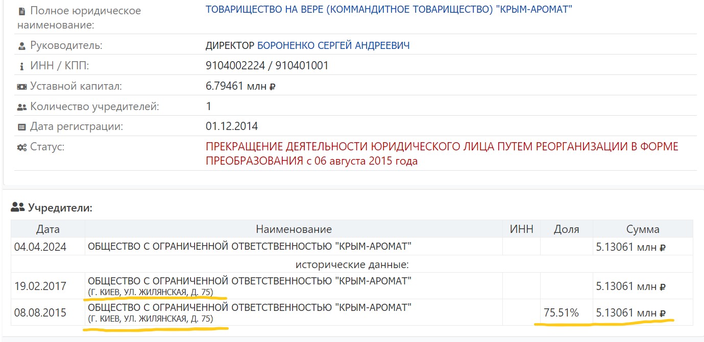 Interestingly, Krym-Aromat LLC is the legal successor of Krym-Aromat Limited Liability Company, registered in 2014. Pay attention to its founders: