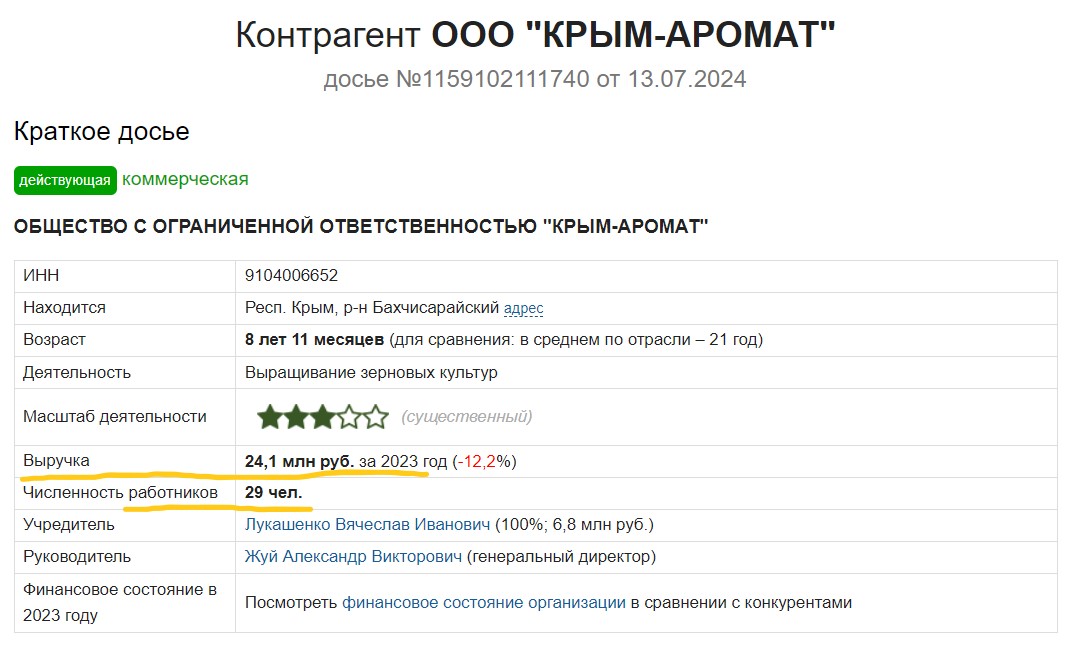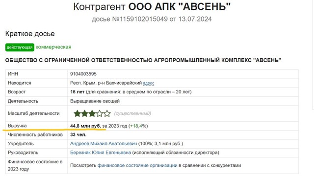 Another Russian "pound" of Dmytro Adamovskyi is Mykhailo Andreyev, to whom Adamovskyi’s 81.21% stake in Krym-Aromat LLC was initially transferred. Andreev is a nominee in AIC Avsen LLC, which sells vegetables in the Bakhchisaray district. As you can see, the company is doing very well - it has earned almost 45 million rubles.
