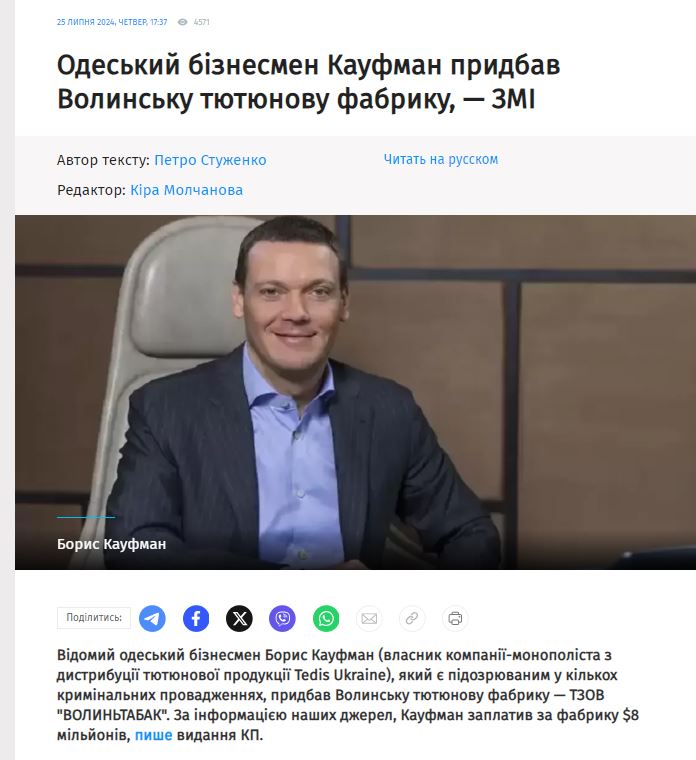 Sources also say that it was precisely in consortium with Kaufman that Stakovychenko acquired "Volyntabak" to establish the same shadow (cash) distribution of cigarettes under it.