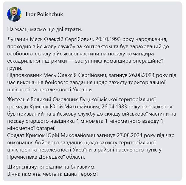 It is reported that a resident of Lutsk, Oleksiy Mes, born on October 20, 1993, served under contract and was appointed to the position of support squadron commander - deputy commander of the operational group.