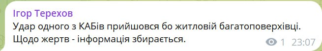 In Kharkiv, the impact of one of the GABs hit a residential high-rise building. Regarding casualties – there is no information yet.