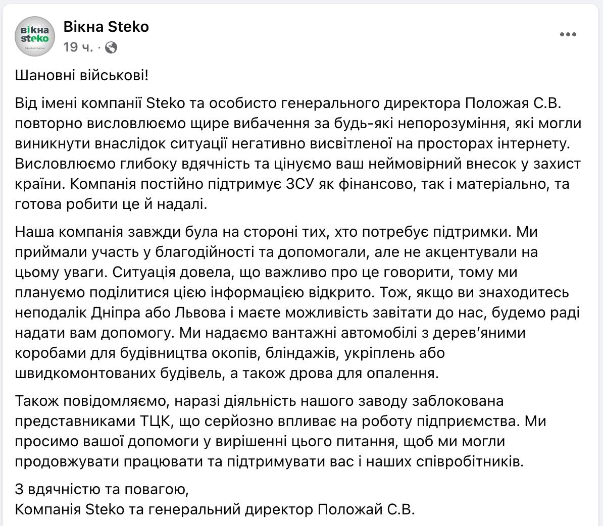 On behalf of Polozhai, "sincere apologies for any misunderstanding" were published. The company claims that it supports the Armed Forces by providing trucks with wooden crates for the construction of trenches, bunkers, fortifications, or quick-assembly buildings, as well as firewood for heating.