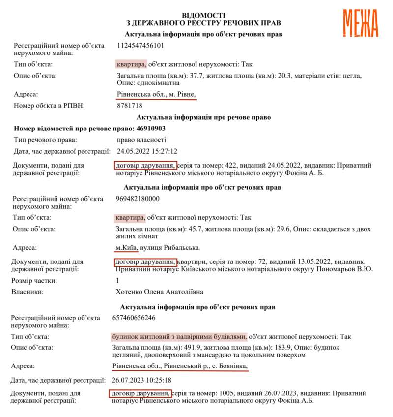 In the third month of the full-scale invasion, Khotenko received two apartments as gifts from her Russian citizen mother. Again, the real estate price is clearly undervalued. The declared value of the apartment in Rivne is 50 thousand UAH.