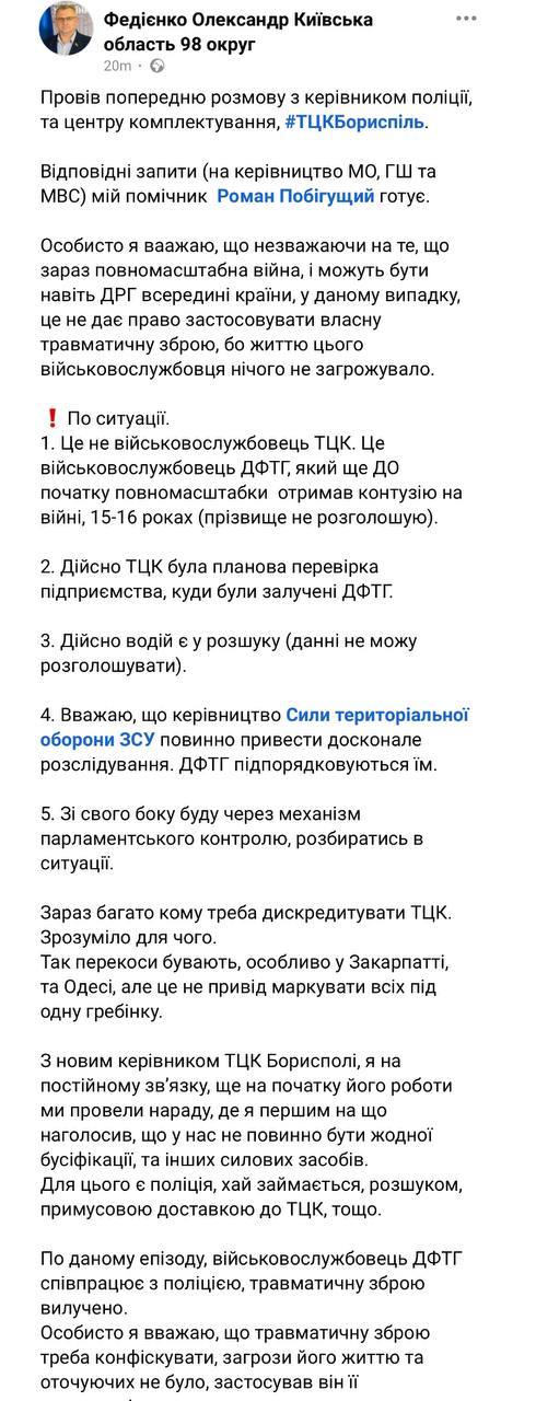 Meanwhile, Fediyenko raises the question: "on what grounds did the VYCF serviceman use his own traumatic weapon, considering that there was no threat to his life or the lives of others?" According to the MP, an investigation is underway.