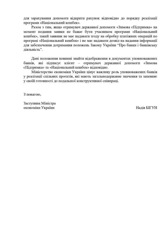 The Ministry sent banks "an explanation regarding the inadmissibility of excessive requirements for the disclosure of banking information" in the context of implementing state programs "Winter Support" and "National Cashback."