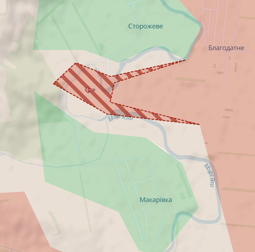 According to a new map from DeepState, a strike attack from Blahodatne has virtually isolated Makarivka from the neighboring Storozheve. There has also been an advance towards Storozheve from the western direction.