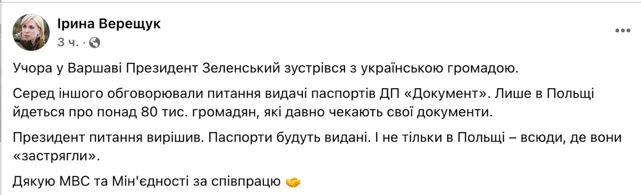 "The President has resolved the issue. Passports will be issued. And not only in Poland - everywhere they are ’stuck’," writes Vereshchuk.