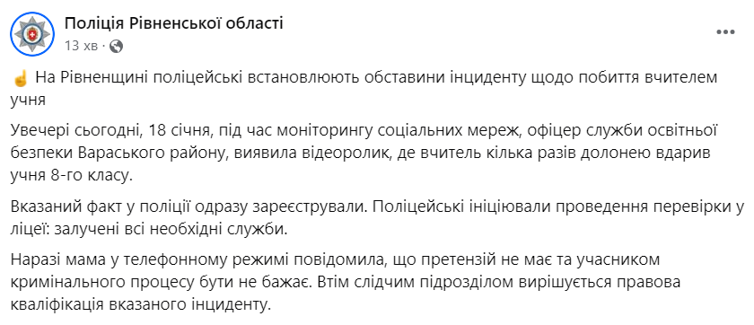 У свою чергу поліція зареєструвала факт побиття вчителем учня 8 класу місцевого ліцею.