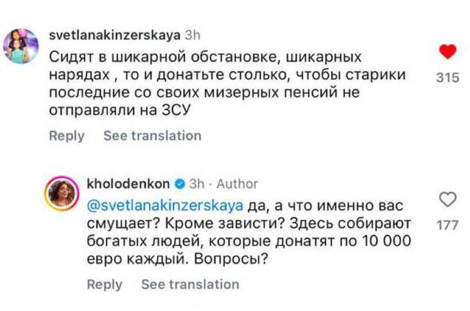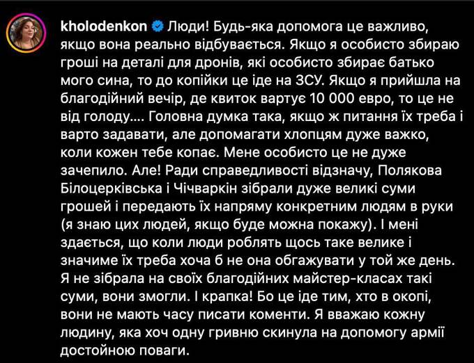 Under the post with the video, users began to write that it is inappropriate to demand that Ukrainians donate their last money while attending luxurious parties. After this, Kholodenko deleted the video with Polyakova and published a new post in which she emphasized that it doesn’t matter how the money is raised, the important thing is that it is "directed to the trenches." She urged "not to criticize those people who are doing such important and significant work."
