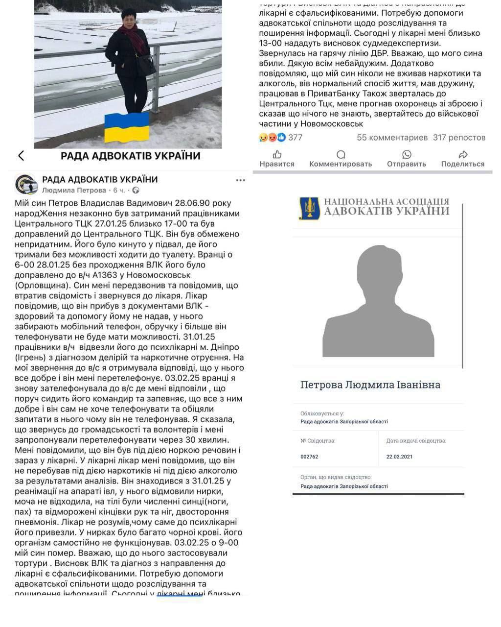 The son of a lawyer from Zaporizhzhya, Lyudmyla Petrova, died after being taken to the TRC.