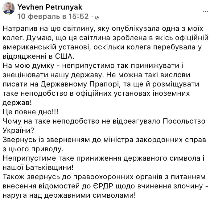 This photo was posted by MP from the "Servant of the People" party, Yevhen Petruynyak, who threatened to contact law enforcement agencies for the insult to the state flag of Ukraine.