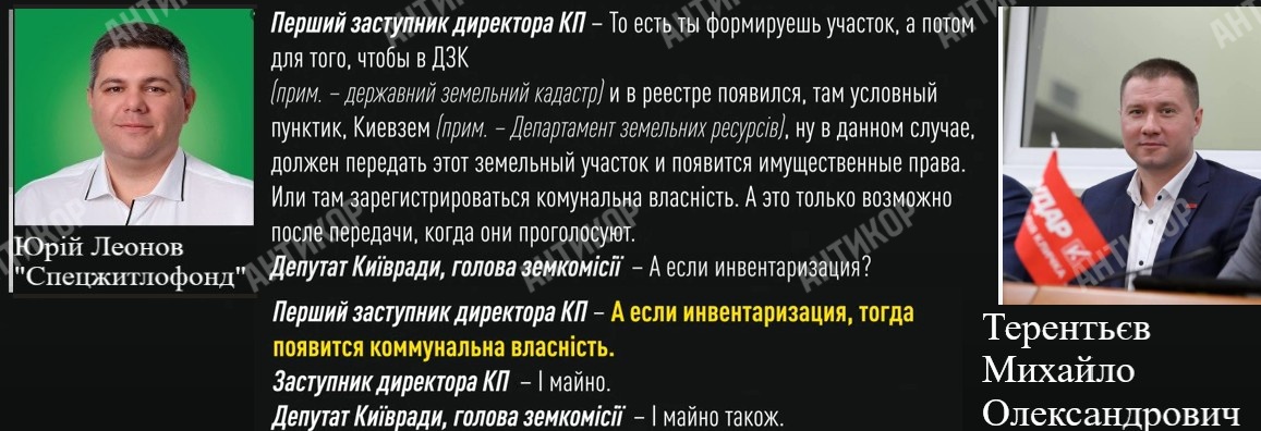 How land moves from municipal ownership to private hands is explained in the intercepted conversation between land commission head Mykhailo Terentyev and KP "Spetszhytlofond" deputy director Yuriy Leonov. Everything genius, as you can see, is simple - you just need to properly draft documents and use your influence.