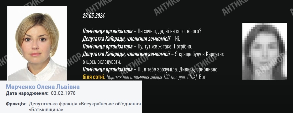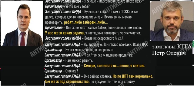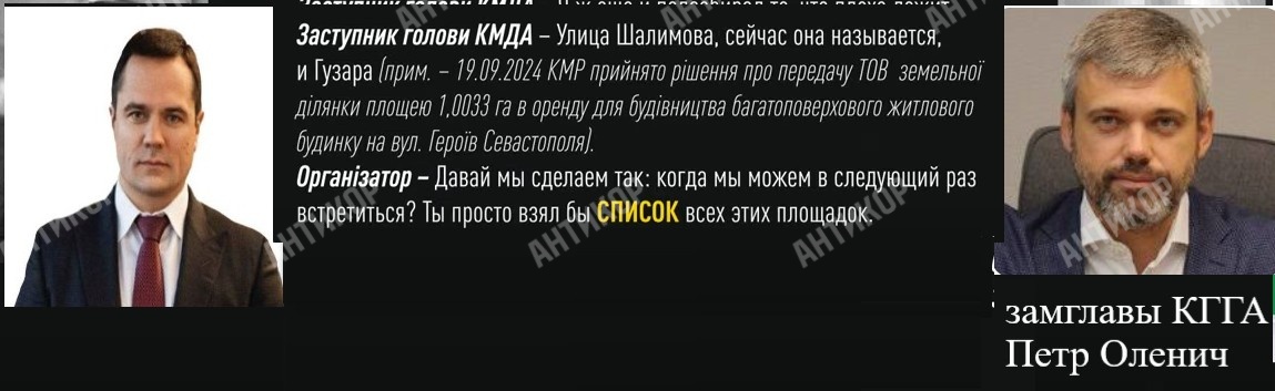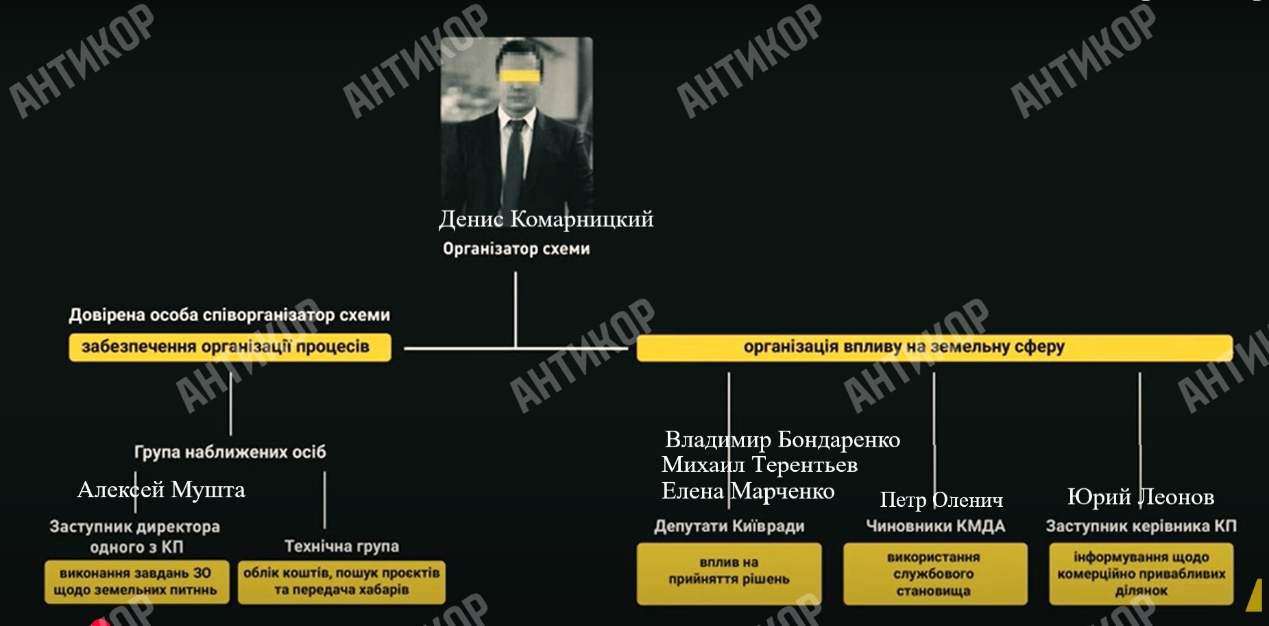 NABU, without having a court decision on the guilt of the involved persons, does not name their surnames. However, following the scandal that erupted, arrests and dismissals occurred in the Kyiv City Administration, and some names became known. At the head of the scheme was, quite expectedly, Denys Komarnytskyi, who is reportedly either still in Ukraine or has long left its borders. In any case, he is currently on the run. Among other loud names are Klychko’s deputy Petro Olenych, Kyiv City Council Secretary Volodymyr Bondarenko, head of the Kyiv City Council land commission Mykhailo Terentyev, deputy director of ME "Spetszhytlofond" Yuriy Leonov, deputy director of ME "Blahoustrii" Oleksiy Mushta. Furthermore, it is clear that the unnamed "member of the deputies’ land issues commission," who allegedly "earned" one hundred thousand dollars according to phone conversations, is Kyiv City Council deputy from "Batkivshchyna" Olena Marchenko. Therefore, the anonymous organized criminal group scheme of Komarnytskyi from NABU can be de-anonymized.