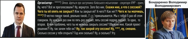 The further leak from NABU sends a big and fiery greeting to local governance in Kyiv and Vitaliy Klychko personally. Because the City Council session activities are guided not by its secretary Volodymyr Bondarenko, but by Denys Komarnytskyi, who has no relation to this council. Komarnytskyi orders Bondarenko to close the session.