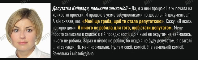 The amount discussed is 100 thousand dollars, which the grateful organizer paid her. And, according to her, his assistant "finally approved the bonus." Which Olena Marchenko "would be better off investing in something in the Carpathians." The money did not come to her for nothing - she works with developers regarding permit documentation. And she became a deputy thanks to Komarnytskyi.