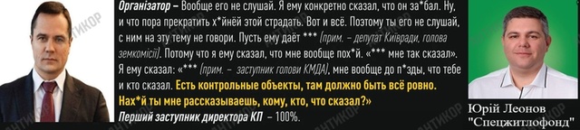 What the outcome of all these leaks will be remains to be seen. Currently, some figures are in detention, some have been released on bail, and Volodymyr Klychko announced the dismissal of KCSA deputy head Petro Olenych, KP "Spetszhytlofond" deputy director Yurii Leonov, and KP "Blahoustrii" deputy director Oleksii Mushta. Regarding deputies mentioned in the investigation, including Kyiv City Council Secretary Volodymyr Bondarenko, the decision should be made by the Kyiv City Council. But the main question is not this and not even whether they will face justice. It’s who will occupy Denys Komarnytskyi’s vacant position as the "watcher" and take over the already tested scheme. Which, it seems, nobody intends to dismantle.