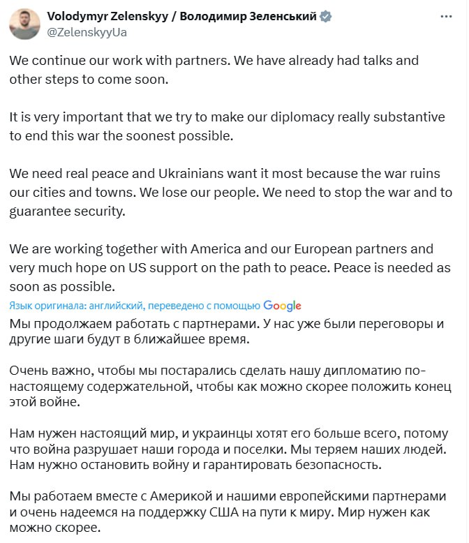 «It is especially important that our diplomacy becomes truly effective to end this war as early as possible. We need a genuine peace, and Ukrainians want it the most because the war is destroying our cities and villages. We are losing our people. We need to stop the war and ensure security. We are working together with America and our European partners and are very hopeful for U.S. support on the path to peace. Peace is needed as soon as possible», – noted the Ukrainian president on X.