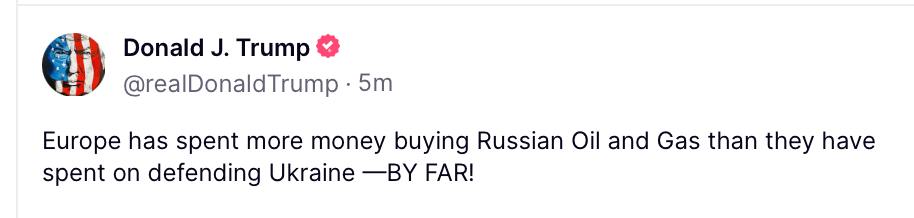 «Europe has spent significantly more money on buying Russian oil and gas than on defending Ukraine!», – wrote the US President on Truth.