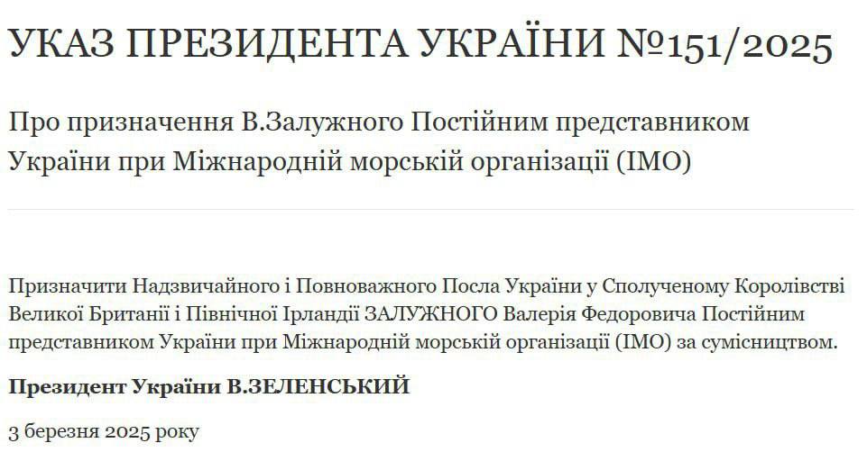 Zaluzhnyi will perform the duties of Ukraine’s representative in the IMO and Ukraine’s ambassador to the United Kingdom concurrently.