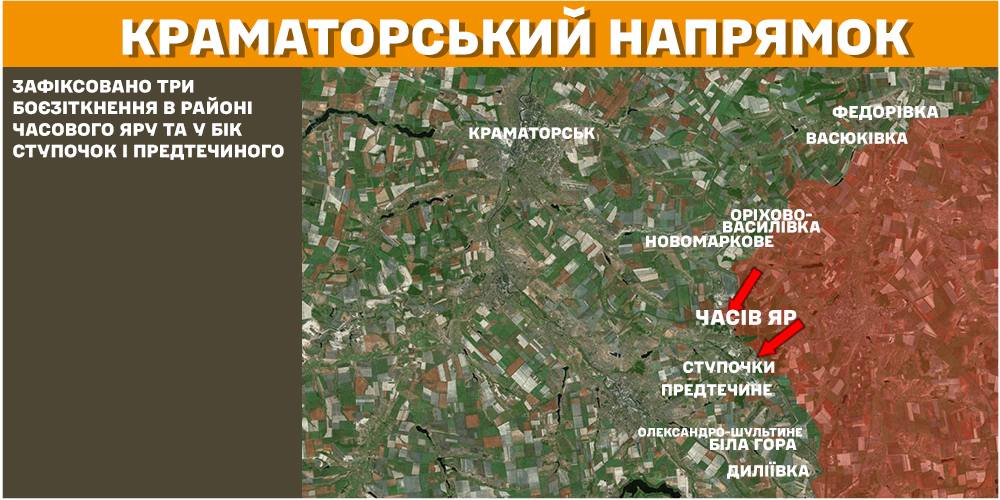 In the Kramatorsk direction there were three combat clashes in the area of Chasiv Yar and towards Stupochky and Pretsechyno.