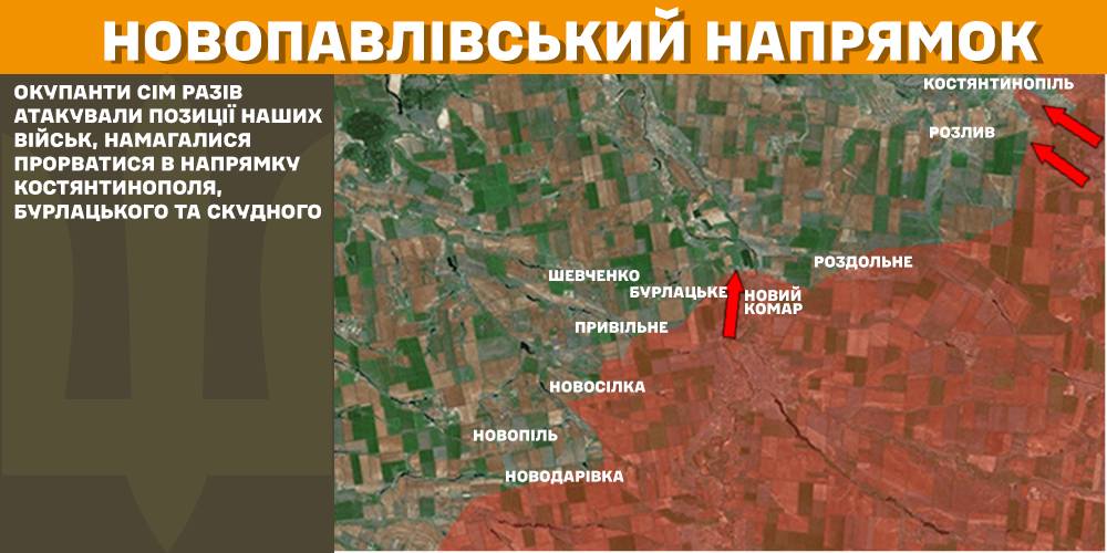 In the Novopavlivka direction the occupiers attacked Ukrainian forces’ positions seven times, attempting to break through towards Kostyantynopil, Burlatske, and Skudne.