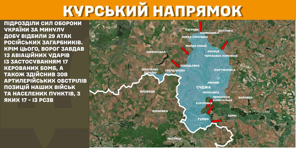 In the operational zone in Kursk, units of the Defence Forces of Ukraine repelled 29 Russian attacks over the past day. Additionally, the enemy carried out 13 airstrikes using 17 guided bombs, and conducted 308 artillery shellings of Ukrainian forces’ positions and settlements, 17 of which were from multiple launch rocket systems (MLRS).