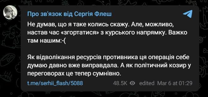“Perhaps the moment has come to ’fold’ from the Kursk direction. It is not easy for us there. As a way to divert the enemy’s resources, this operation, I think, has long justified itself. However, as a political trump card in negotiations, this is now questionable,” writes "Flash".