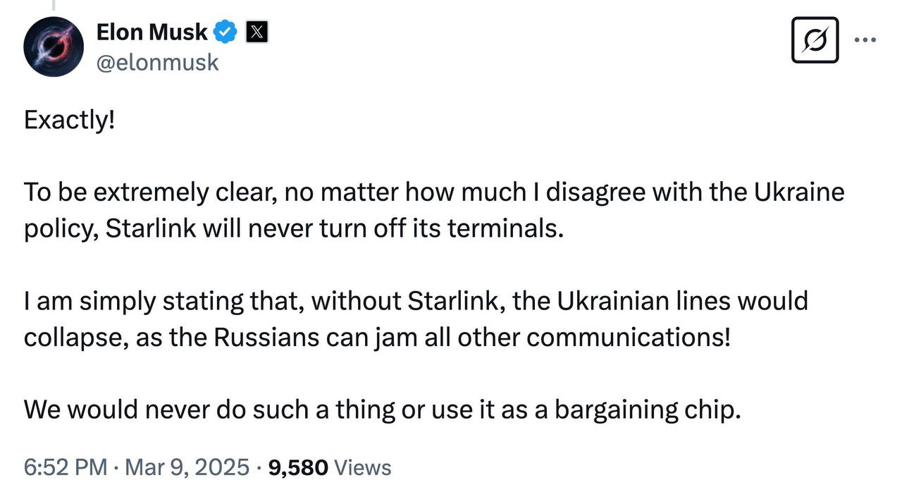 Starlink terminals will never be turned off in Ukraine, - Elon Musk