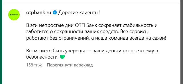 The Russian "subsidiary" of OTP Bank did not clearly express a position after the start of the full-scale war. Instead, the financial institution’s (Russian) clients were assured that they continue to work "in these difficult days."