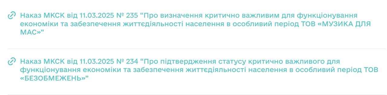 This status was established according to the order of the Ministry of Culture dated March 11 for LLC "BEZOBMEZHEN" (rock band "Bez obmezhen") and LLC "Muzy dla mas" (band "Boombox").