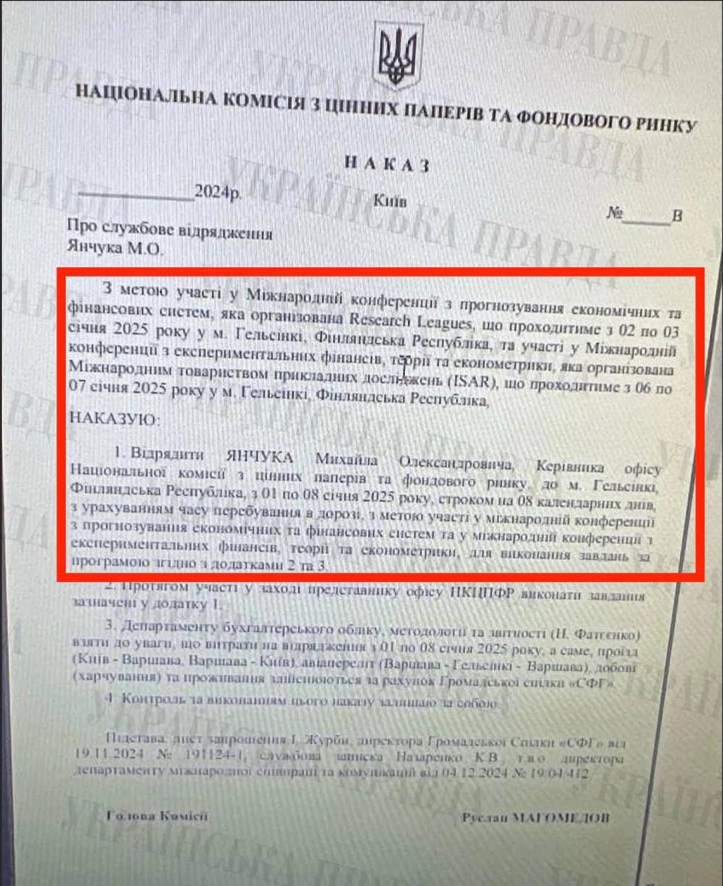 "The National Securities and Stock Market Commission" analyzed the situation that arose in connection with the business trip of the head of the Office, Mykhailo Yanchuk, to a conference in Finland in January 2025 — and "found no signs of breach of labor discipline or other violations in his actions"