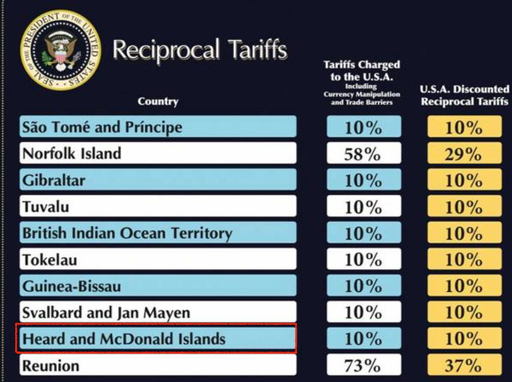 Trump imposed tariffs on the uninhabited Heard and McDonald Islands. A 10-percent tariff was established for them.