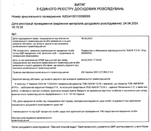 As reported, this criminal case concerns the auctions that are currently being contested in court. The auctions specifically involved the sale of a claim that LLC "Imperiya-Agro" had. Thus, LLC "Imperiya-Agro" had a debtor, with whom legal processes lasted many years, who was supposed to return more than 20 million UAH, which could have been distributed among creditors. However, due to the criminal actions of the Reveruk-Lytvynenko duo, the debtor bought back its debt for only 0.6% of its real value, causing losses to both LLC "Imperiya-Agro" and its creditors. This is the episode being investigated by the SBI.