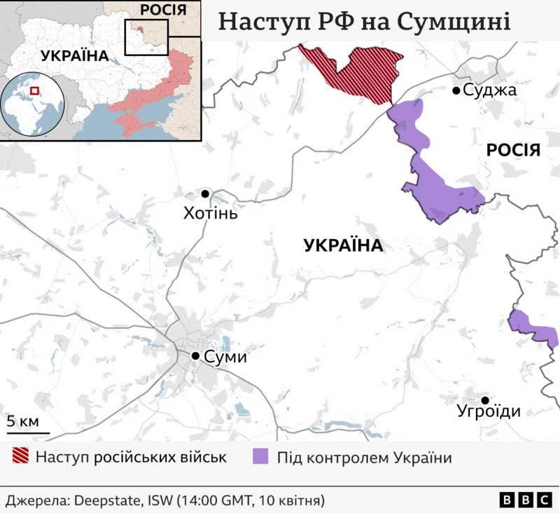 The operation is expected to aim at creating a buffer zone in front of the Russian border. One of the key directions of the offensive will be the high ground between the villages of Yunakivka and Khrapivshchyna, as well as the forested area to the northeast of Sumy and the coast of the Psel River.