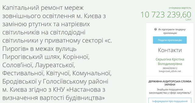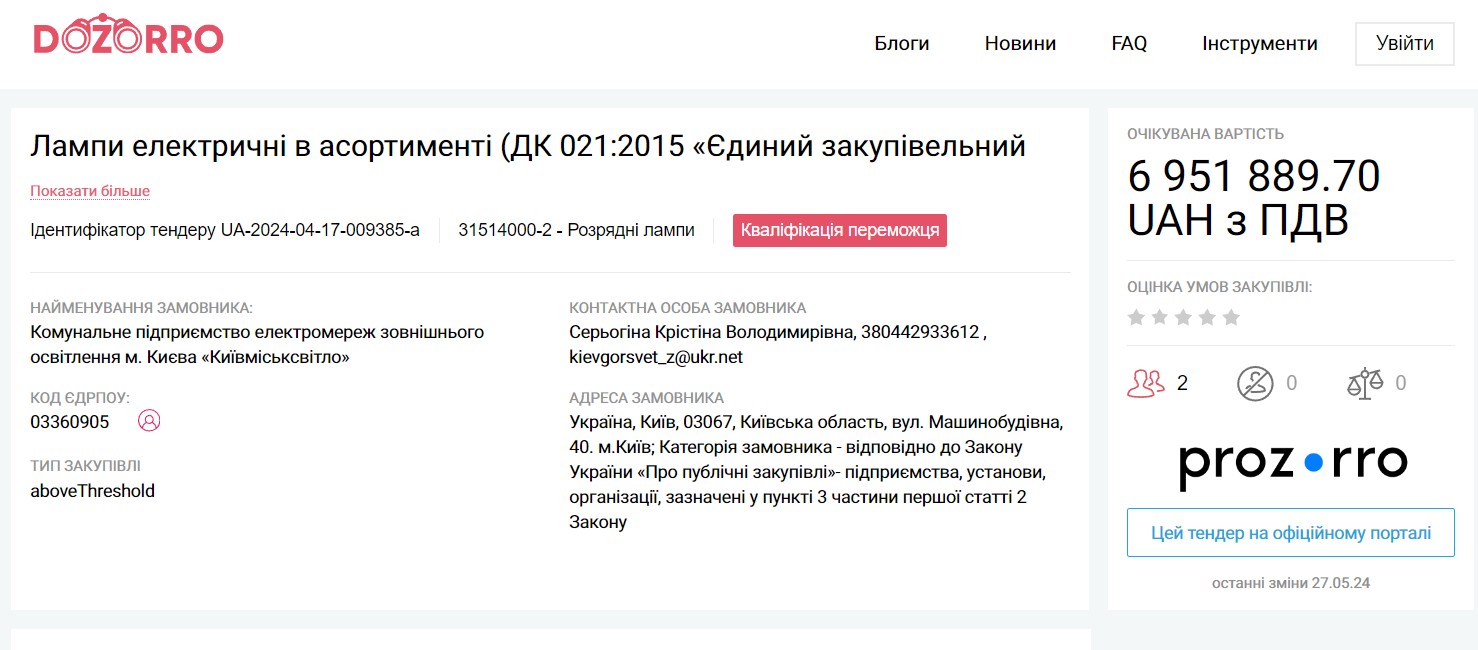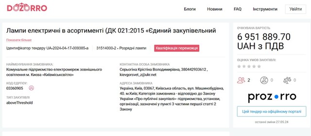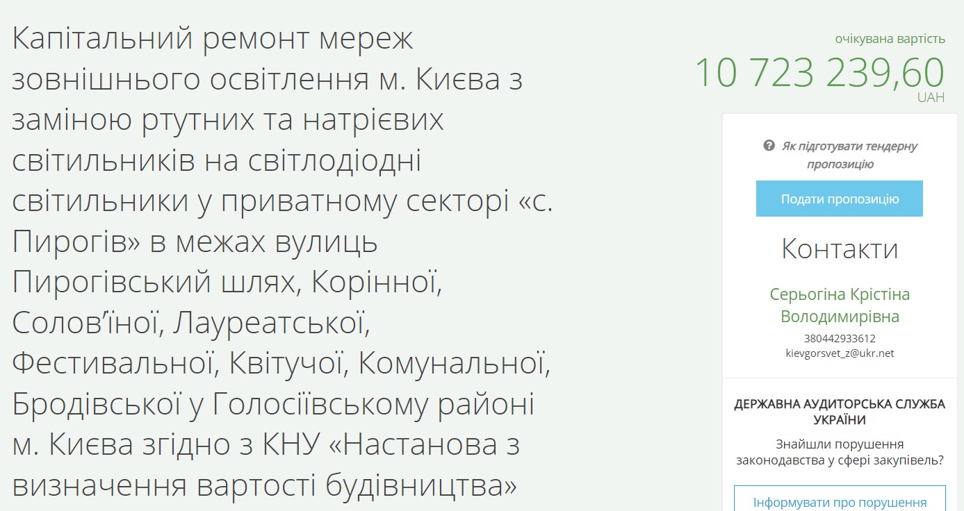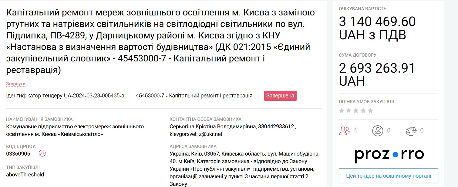All these tenders have already been completed. However, it is easy to find tenders where ME "Kyivmisksvitlo" is still actively receiving applications.
