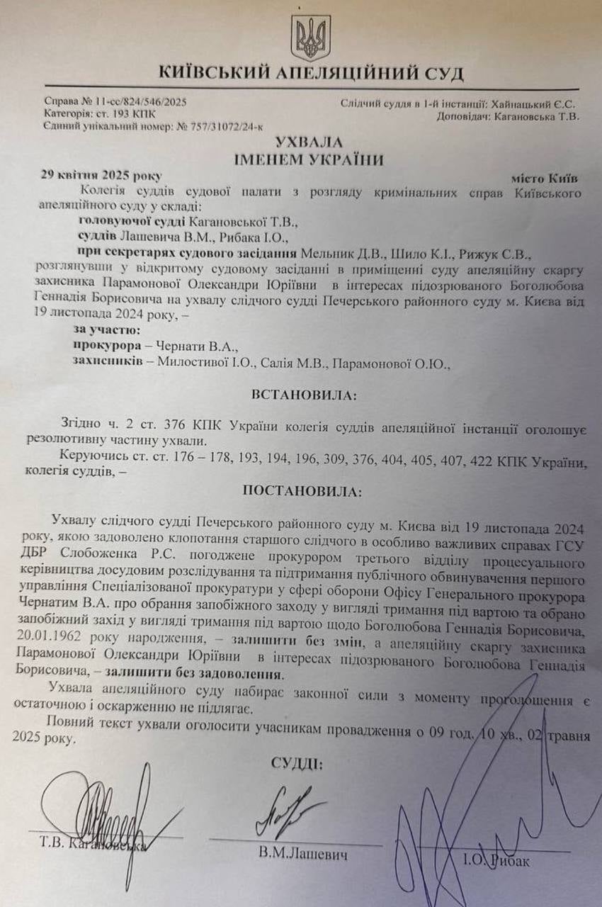 The Kyiv Court of Appeals upheld the decision to arrest the oligarch Hennadiy Boholyubov, who is evading justice.