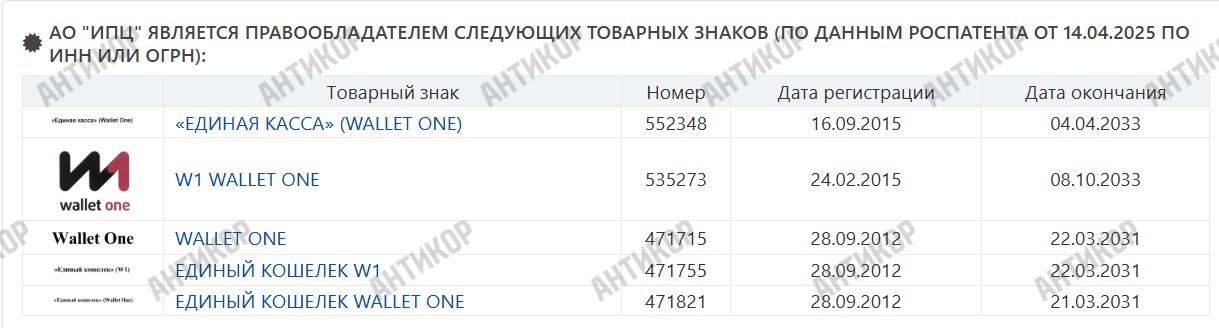 Verification in Russian registries confirms this information. The owners of LLC "Information Processing Center" are Russian citizens Andrey Girin and Andrey Goryachkin, and LLC "Information Processing Center" owns the trademarks, including Wallet One.